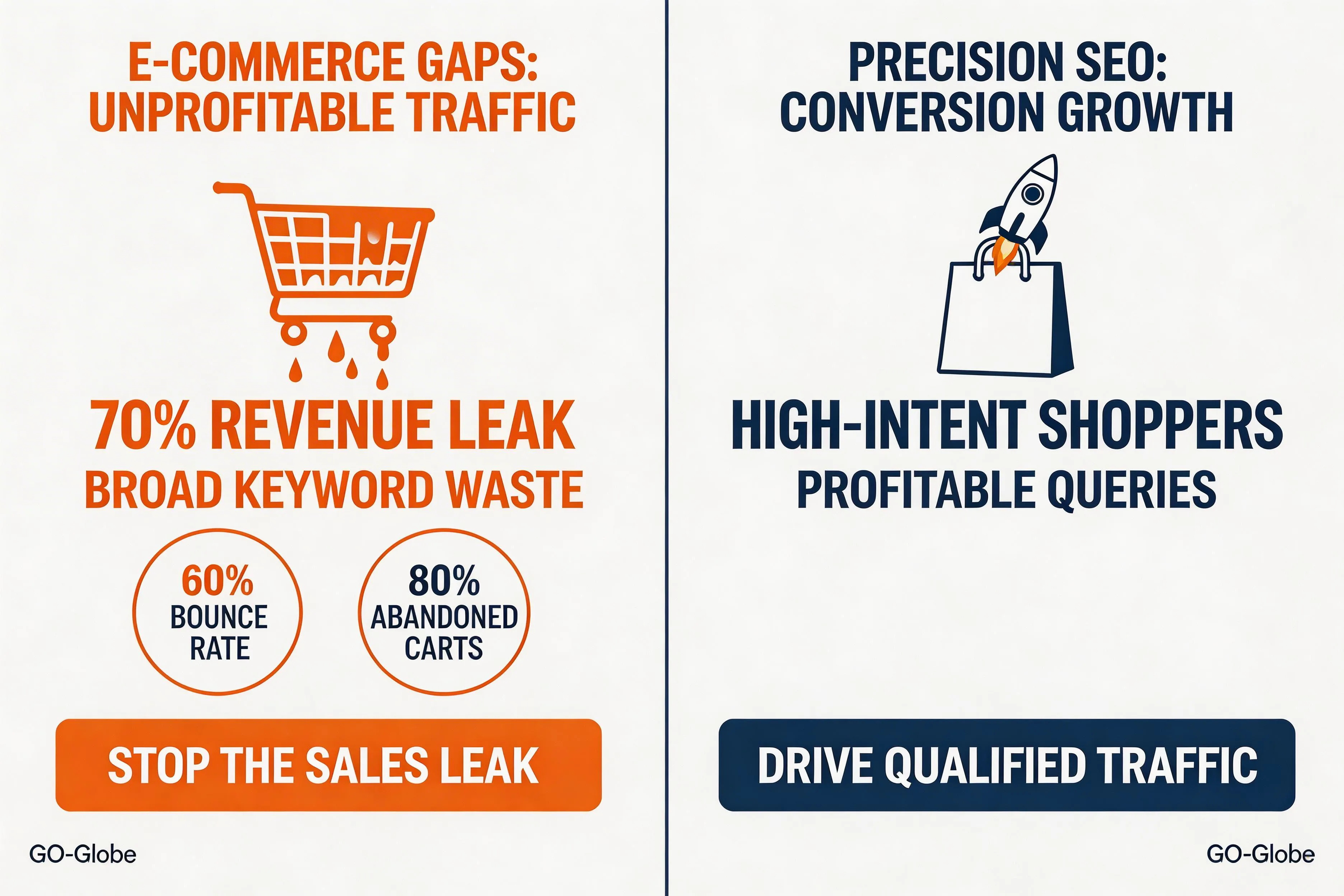 E-commerce success requires navigating intense competition and complex inventory management. Without precise optimization, businesses face severe penalties and lost visibility. GO-Globe solves these hurdles through targeted strategies: